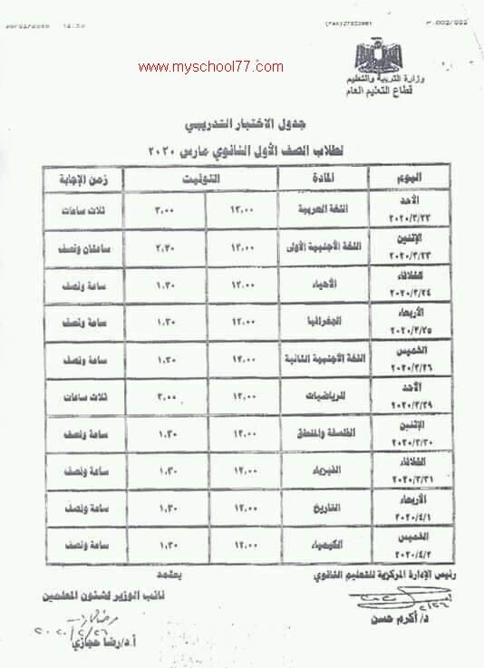 جدول الامتحان الالكترونى التدريبى للصف الأول الثانوى مارس 2020 على التابلت