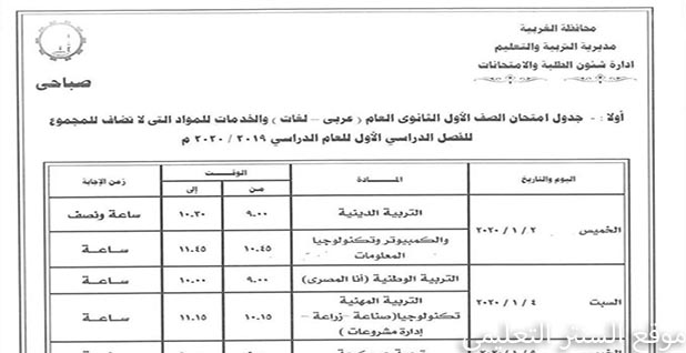 جدول امتحانات المواد التى لا تضاف للمجموع للصف الاول والثانى الثانوى ترم اول 2020 محافظة الغربية